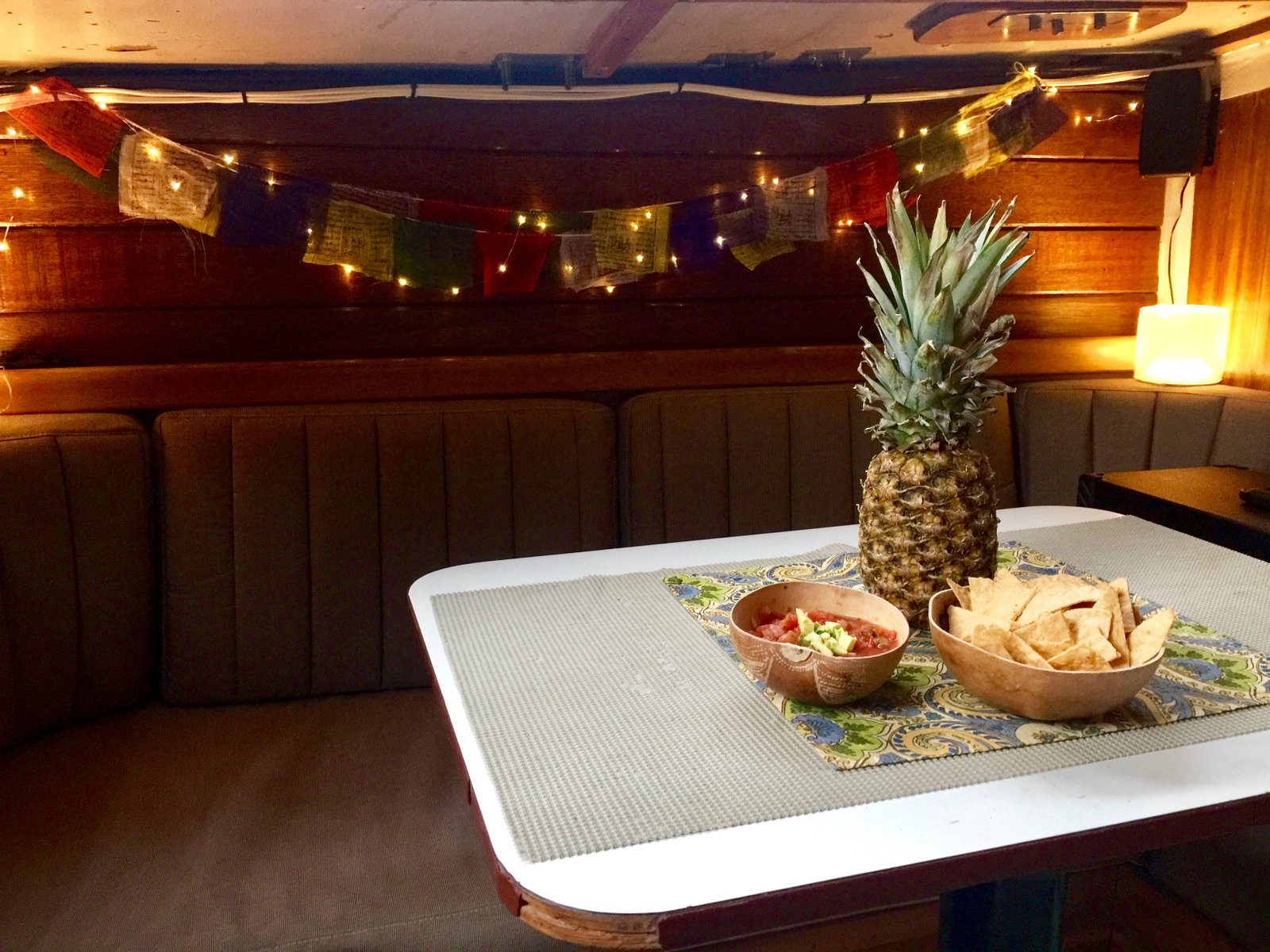 We had company coming over, so this is why this looks so put together. This is opposite the galley. From the end seat, I can literally reach over to the stove and grab more veggies if needed. Seconds, anyone? I got you.
