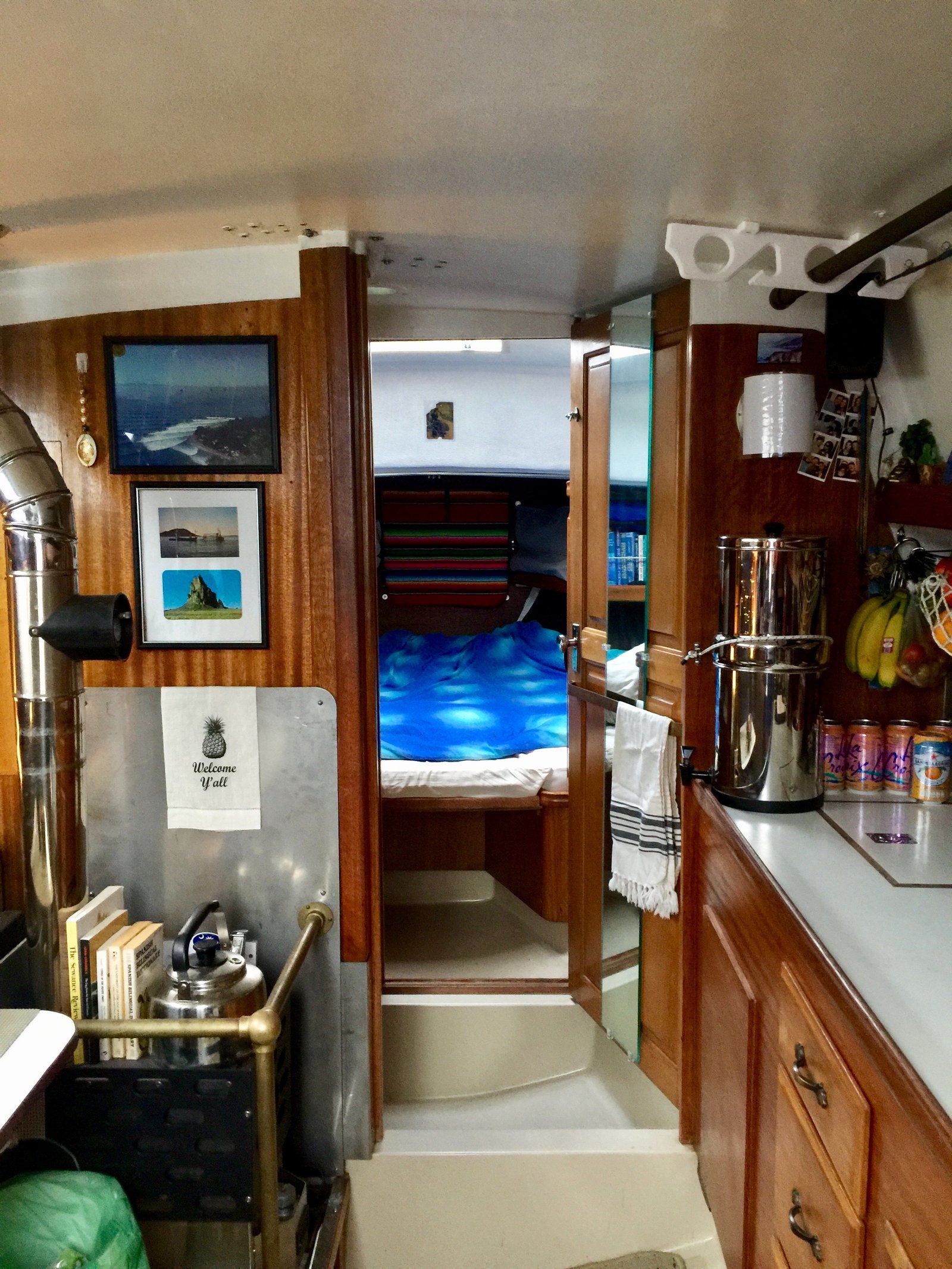 The inside of Astrologer looking from the companionway steps. To the right is the “galley” (or kitchen) and straight back is our master bedroom or what sailors call a “V-berth”.