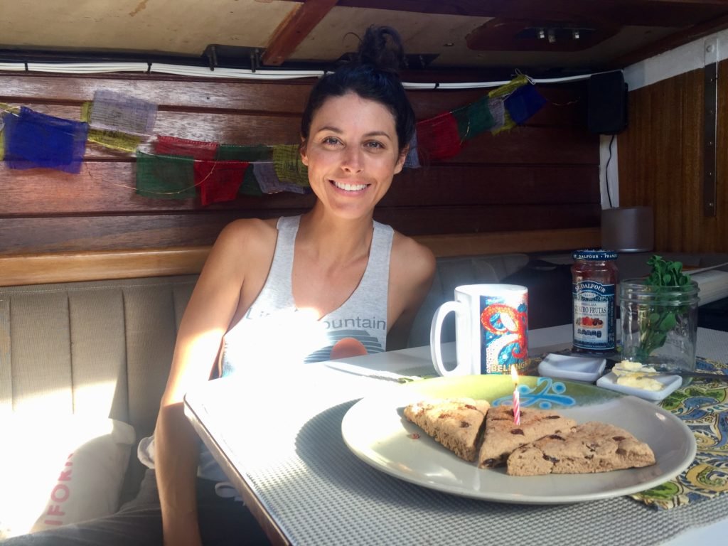 I was celebrating my 35th birthday with freshly made scones (by Chris!) while anchored in Bahia Santa Maria on the Pacific side of Baja. This is my favorite anchorage on that coastline. After breakfast, Chris and I snorkeled near the coast and he caught a lobster for my birthday dinner.