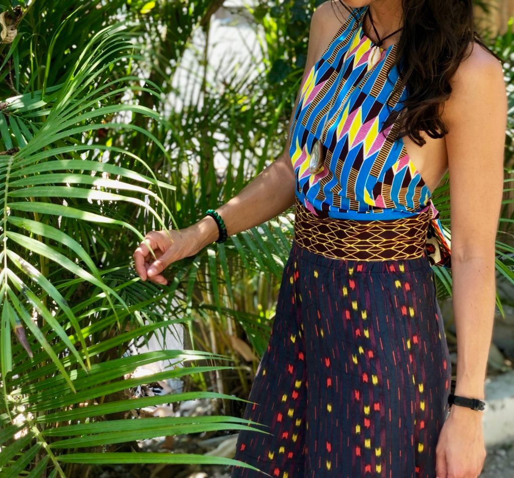 I also love any garments that are reversible or can be worn in several ways, like our Mamie Reversible Festy Top (seen below).
