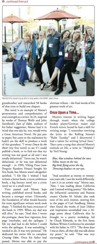 Monte then found the works of Joan Didion and inspiration snowballed into a twenty-six-page poem about California which he brought to a poetry workshop, lead by Chuck Edwards, at the first Santa Barbara Writers Conference he attended with his father in 1975.